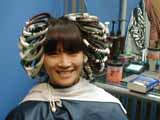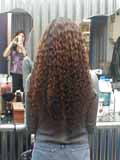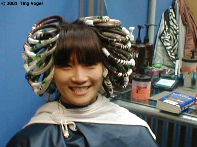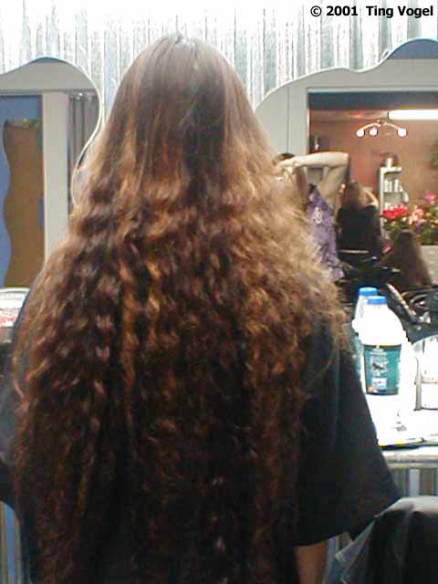 Because my hair is so long, she uses these rods on the strands that clip together at the end to make the process go twice as fast. It is also easier on my neck. In the old days, when I used to have those little rods on my head, my head would weigh an extra 5 pounds. The rods make me feel like Goldilocks (well, just the locks without the gold part). And here are the results from Diana's magic fingers! Just call me Fluffhead!