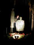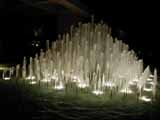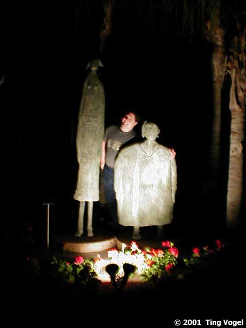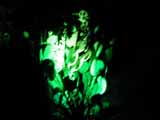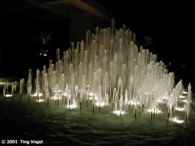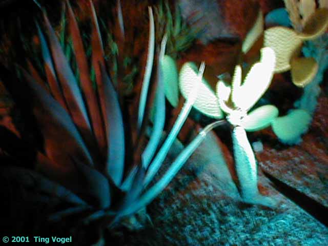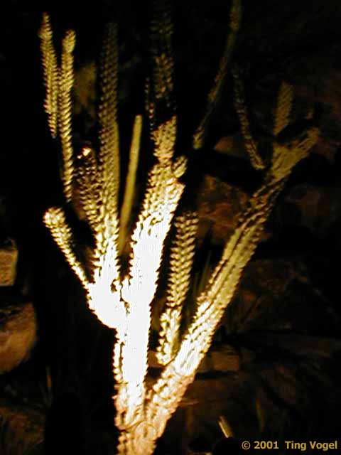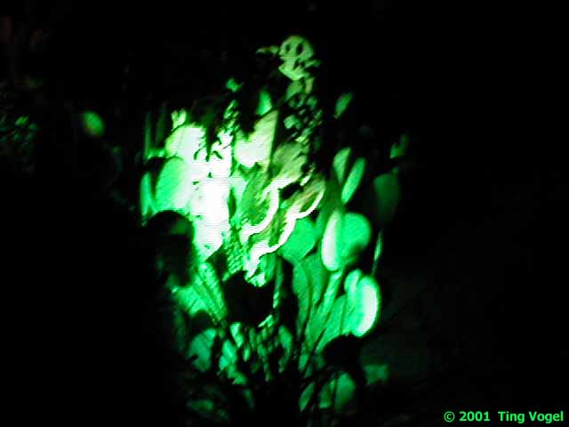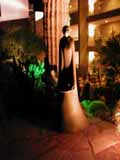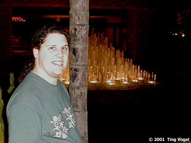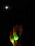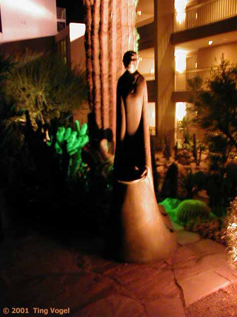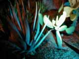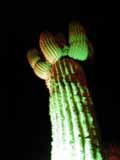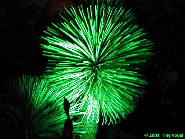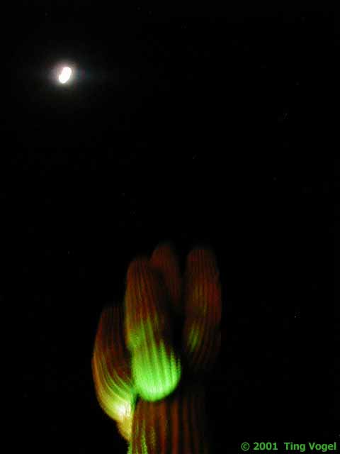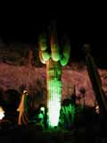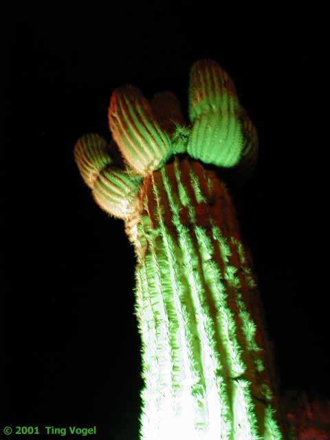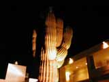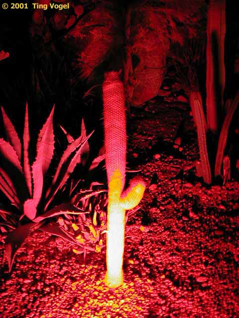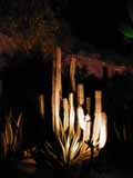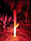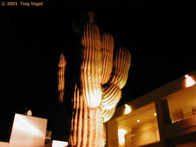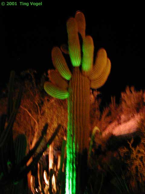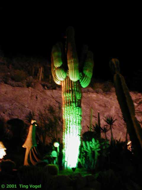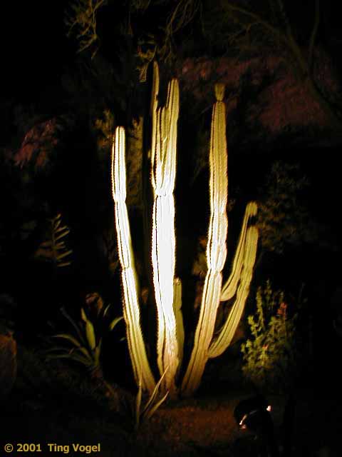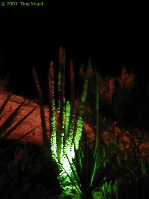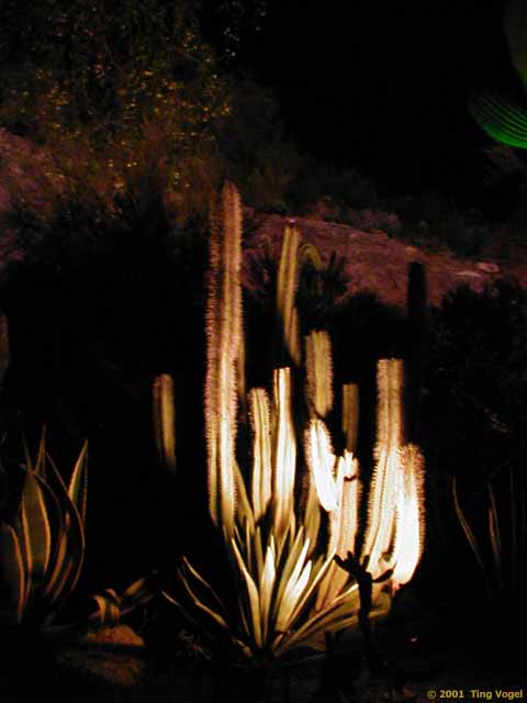 Upon returning to the hotel, we decided to go visit the cactus garden lining the hillside across from the main lobby. The garden was deserted. Red, green, yellow, and blue mailbu lights spotlighted various cacti in an eerie unearthly splendor. The cloak of darkness gives everything a different personality.