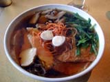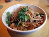 The day passed uneventfully and I picked up Ting for dinner a little after six pm. We decided on the Long Life Noodle Company & Jook Joint in the Stanford Shopping Center...and so you can see that Ting had a Ginseng Ginger Ale to drink (I think I had a Full Sail Ale), together with a large bowl of Earthly Cultivation -  Soba (buckwheat) noodles with grilled chicken, shiitake mushrooms, quail eggs and julienne of scallions and carrots in a dashi-bonito infused broth. I had the Chicken Chow Fun (wide chewy noodles wok-tossed with green onions, sprouts, and Chinese black bean).